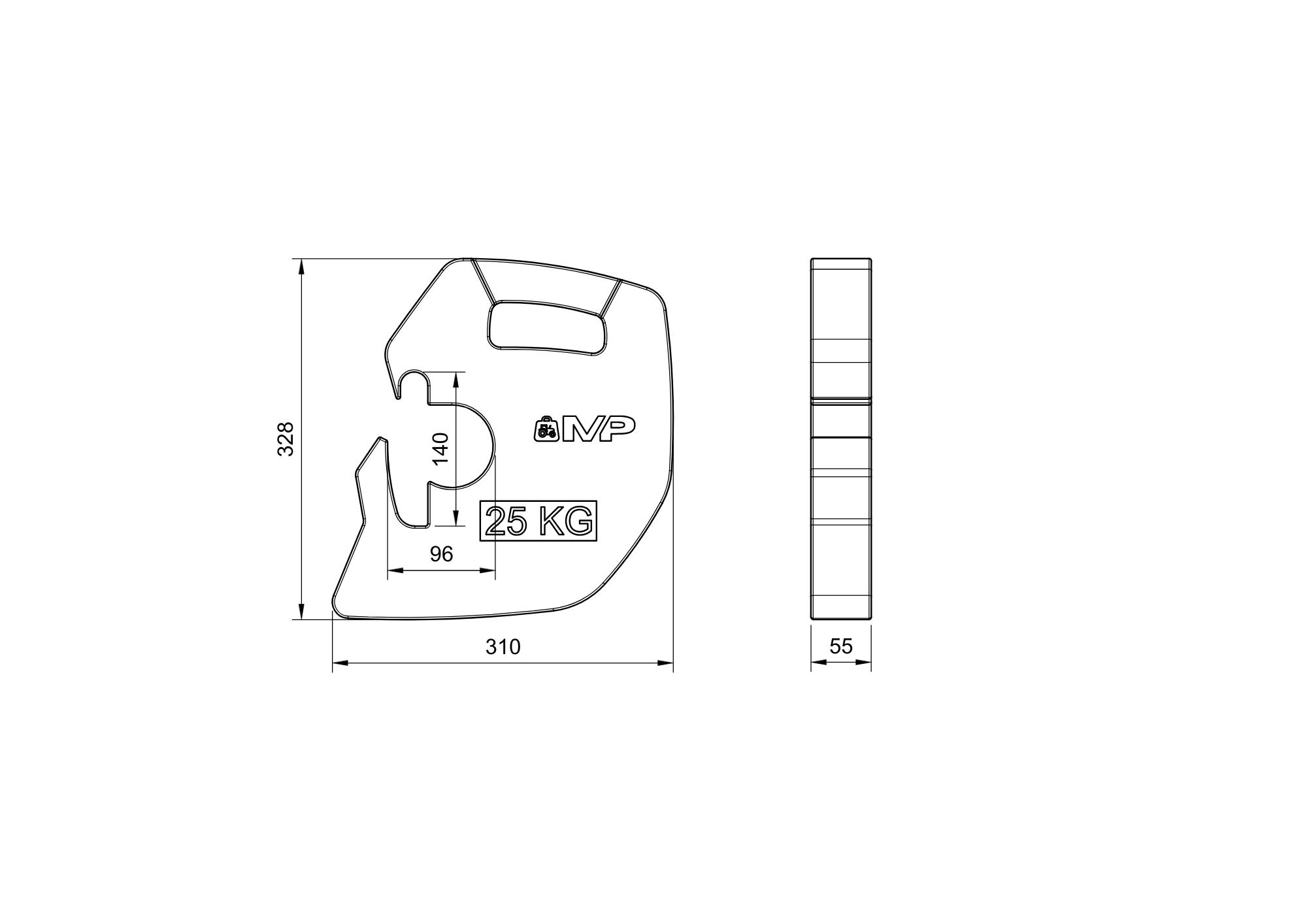 Contrapeso delantero para tractor Kubota de 25 kg. Fabricado en hierro fundido. Pintada de negro o gris.